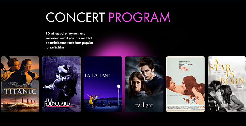 Jūsų laukia hitai iš filmų Titanic, La La Land, A Star Is Born, Twilight ir daugybės kitų — melodijos, kurias atpažįstate iš pirmųjų taktų. Kamerinis orkestras Tynda Music suteiks joms naują skambesį ir sukurs atmosferą, kurioje norisi kvėpuoti giliau, jausti stipriau ir mylėti drąsiau. Tai muzika, kuri tarsi švelniai paima už rankos ir primena, kad meilė visada šalia.
